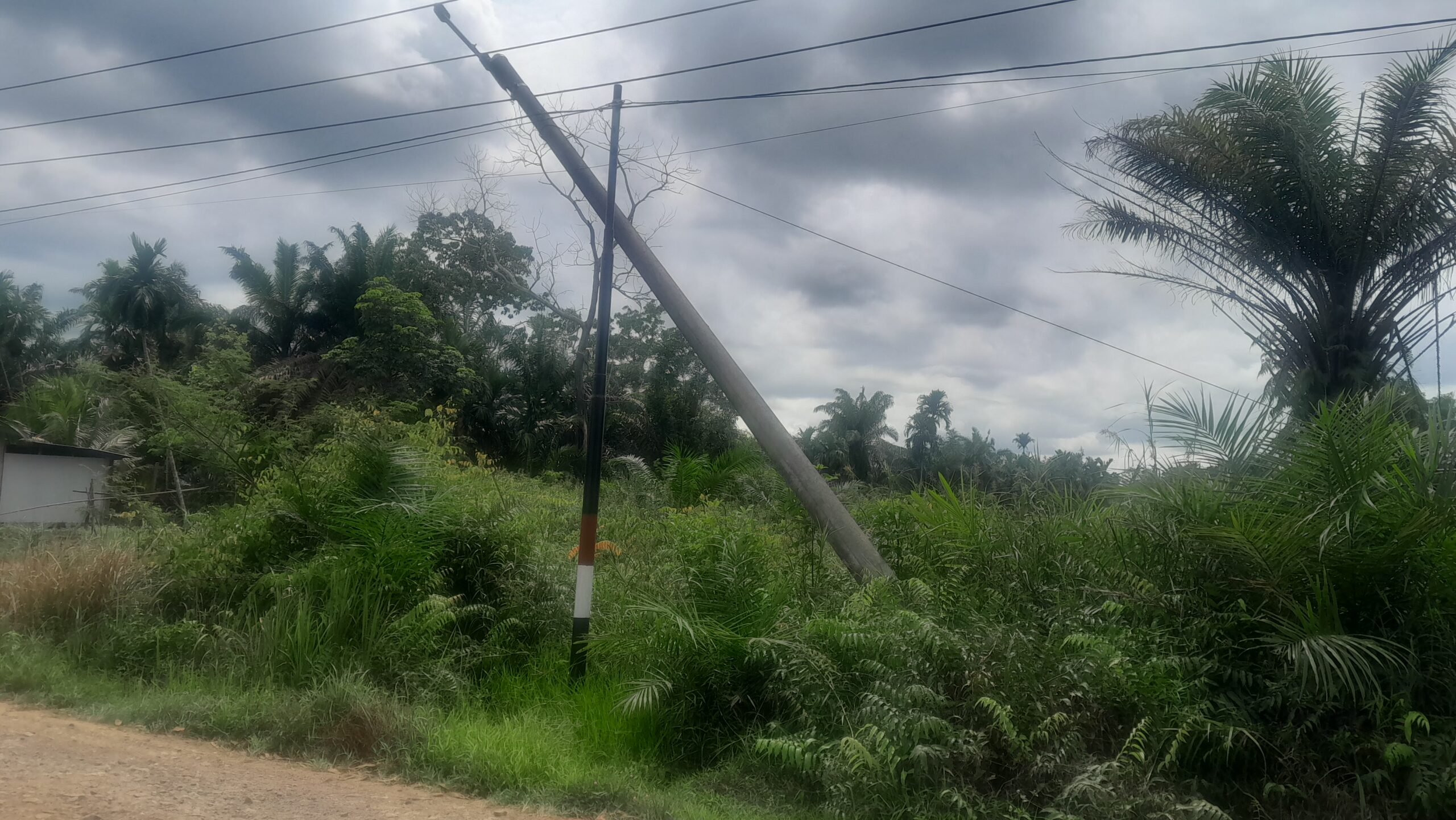 Beruntung tiang tersebut saat ini ditahan oleh kabel yang saling menghubungkan, kalaulah tidak ditahan oleh kabel tersebut mungkin sudah tumbang.Dikawatirkan lambat laun akan tumbang dan terjadi hal yang tidak diinginkan.