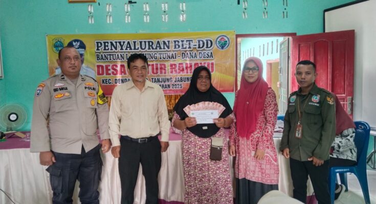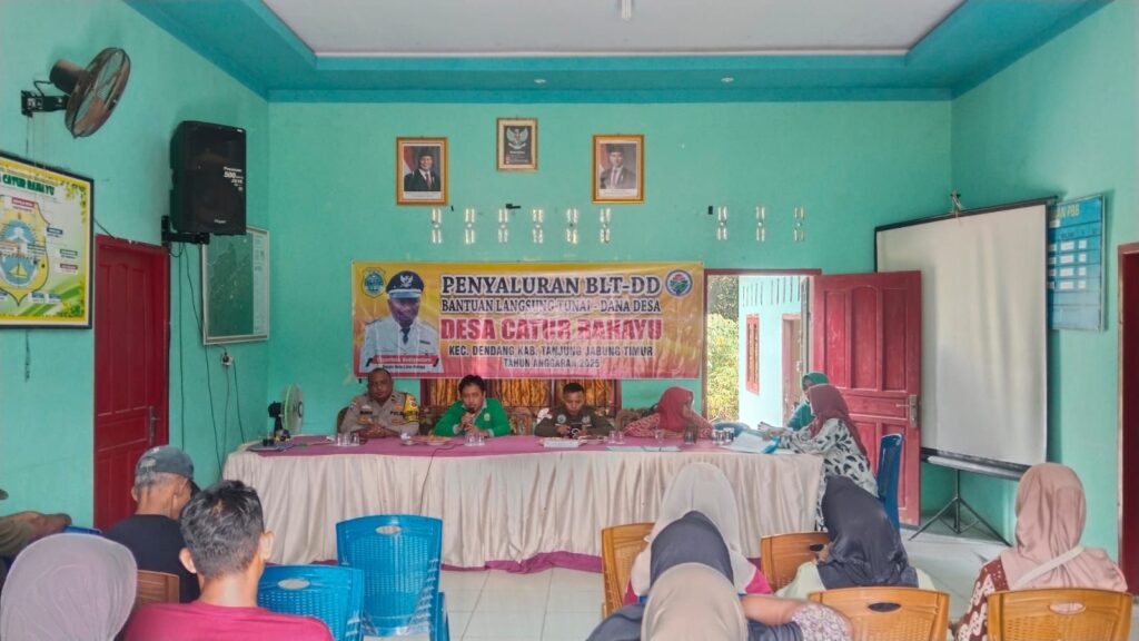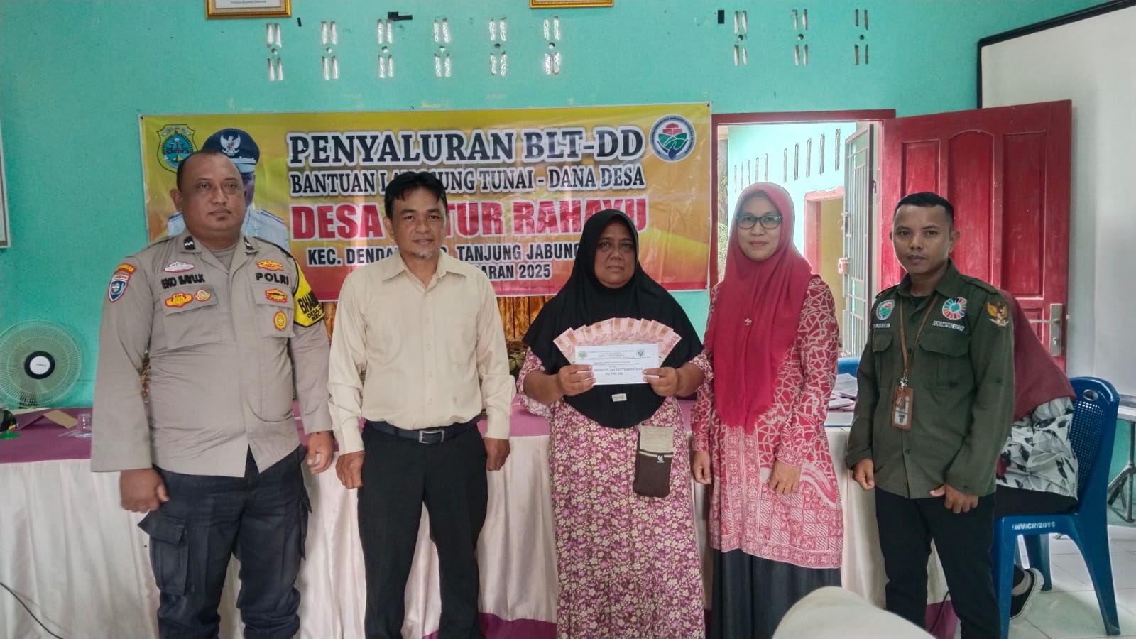 Didampingi Bhabinkamtibmas Pemerintah Desa (Pemdes) Catur Rahayu Kecamatan Dendang Kabupaten Tanjung Jabung Timur (Tanjabtimur) Jambi membagikan BLT- DD triwulan lll.Bertempat di aula desa. Kamis (25 September 2025).