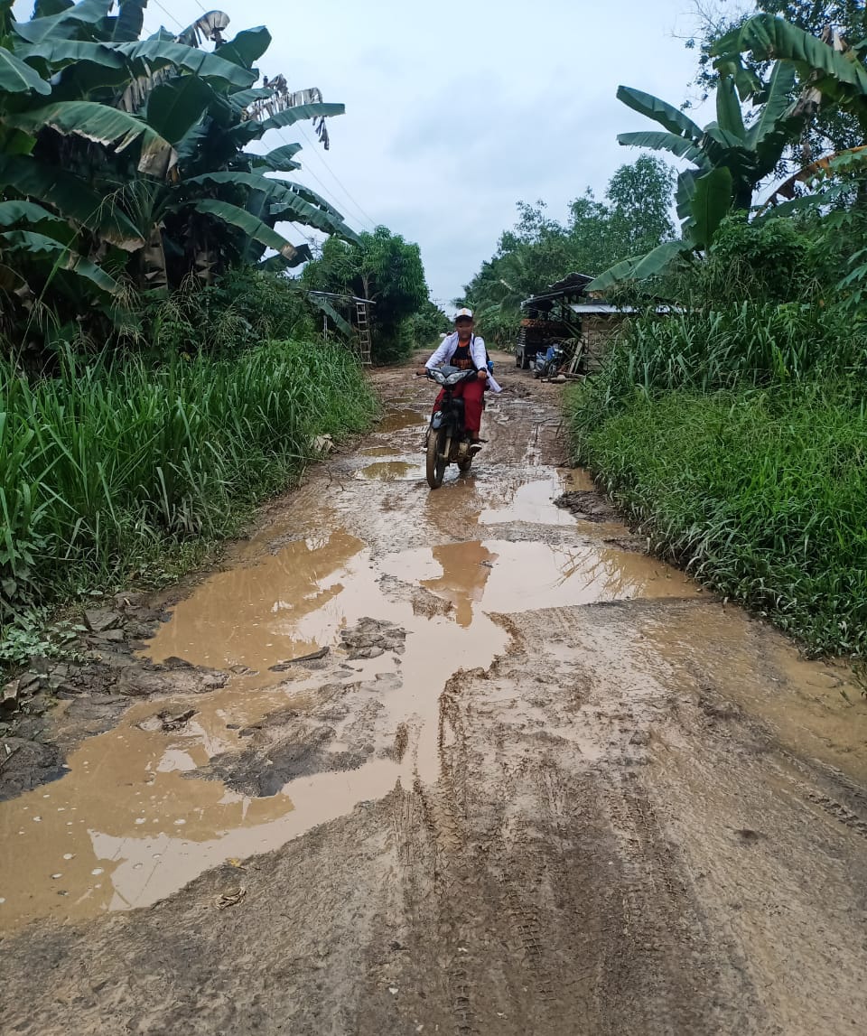 Pantauan di lapangan menunjukkan jalan tersebut mengalami kerusakan cukup parah, dipenuhi lubang besar yang tergenang air serta permukaan jalan yang berlumpur dan tidak rata.